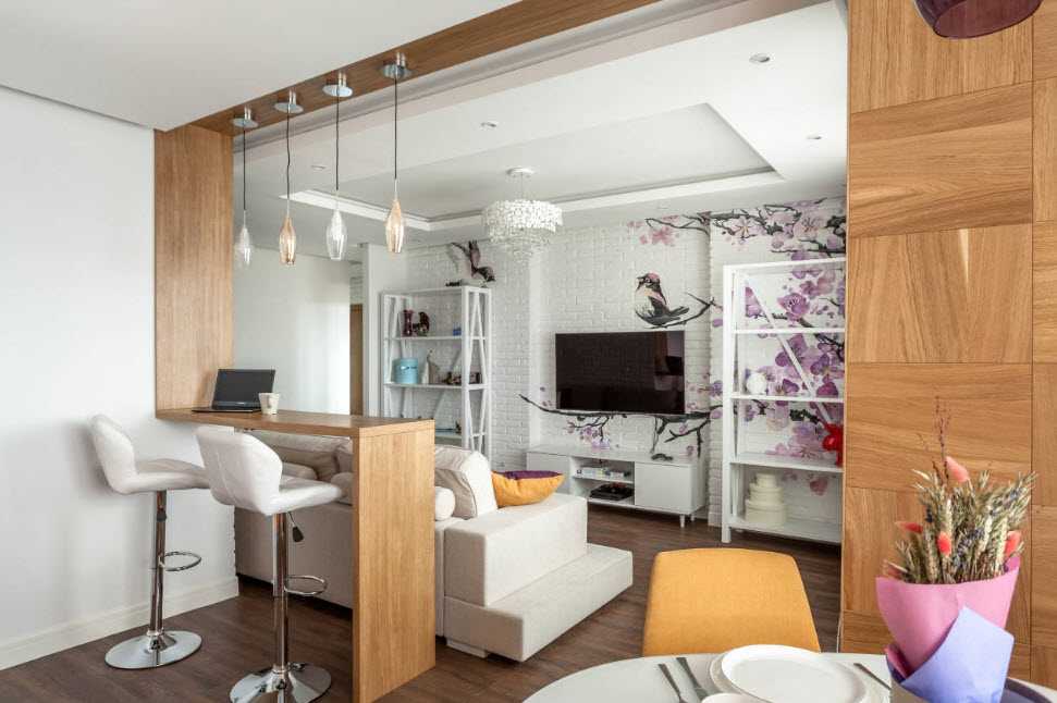 Многие дизайнеры рекомендуют для отделки стен, пола и потолка выбирать белый цвет, но не все владельцы жилья одобряют такое решение, ведь помещение становится неуютным. Белая гостиная выглядит привлекательно, если сочетать ее с мебелью фисташкового, мятного или бежевого цвета.