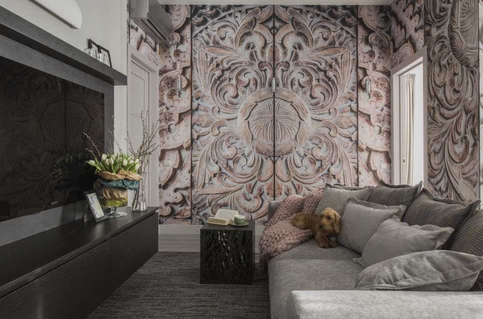 Пример можно увидеть на фотографиях. Здесь наглядно видно, как крупное изображение цветов расширяет зал. Происходит это за счет объемных крупных бутонов. Мелкий рисунок наоборот делает стену более плоской