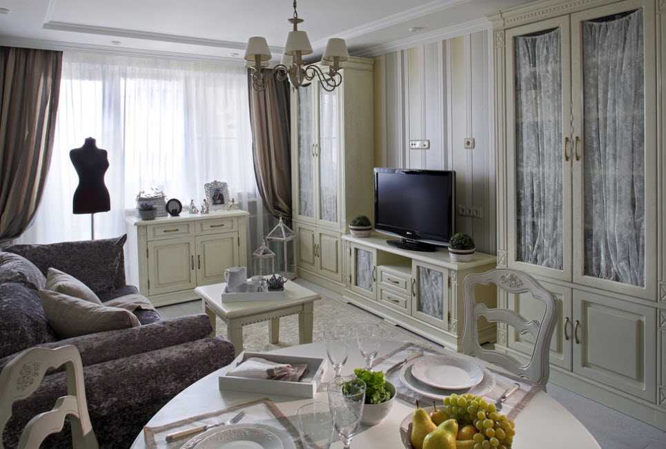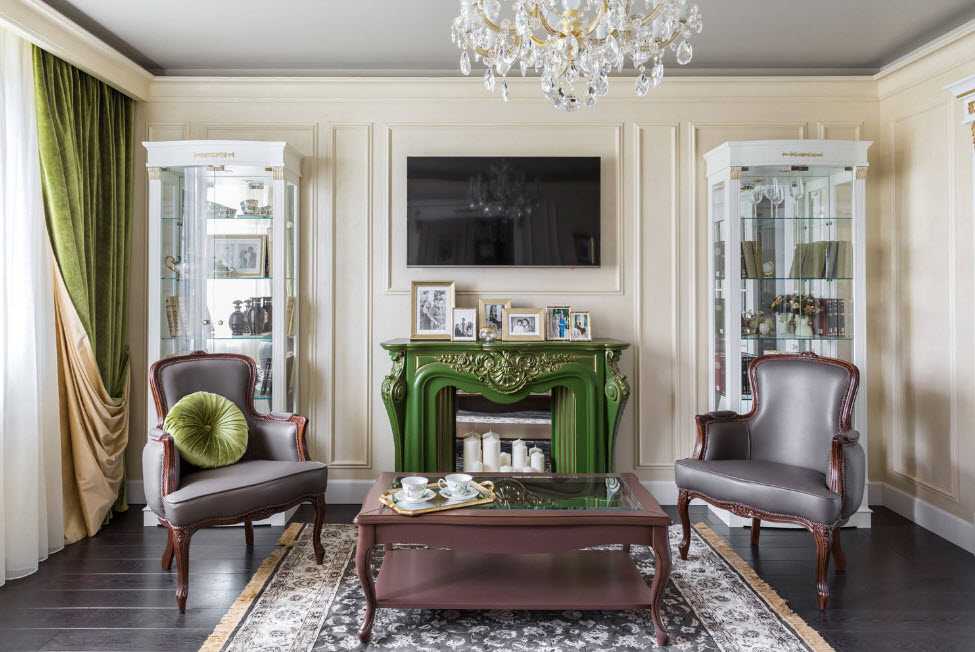 Классику предпочтительно воплощать в тех условиях, где присутствует большая площадь, возможность совмещения с кухонным пространством, масштабностью оконных проемов, пропускающих достаточно естественного освещения, фактурностью текстильных изделий и пород дерева. Они всегда являются главными составляющими интерьера.