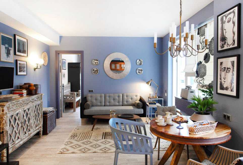 Голубой или бледно-синий оттенки отлично вписываются в интерьер, организованный с помощью простой отделки вагонкой. Такой окрас помещения подойдет, если оно хорошо освещено. Дополнит стиль кресло с синим узором и бледно-серый диван с декоративными подушками, соответствующими основному тону.