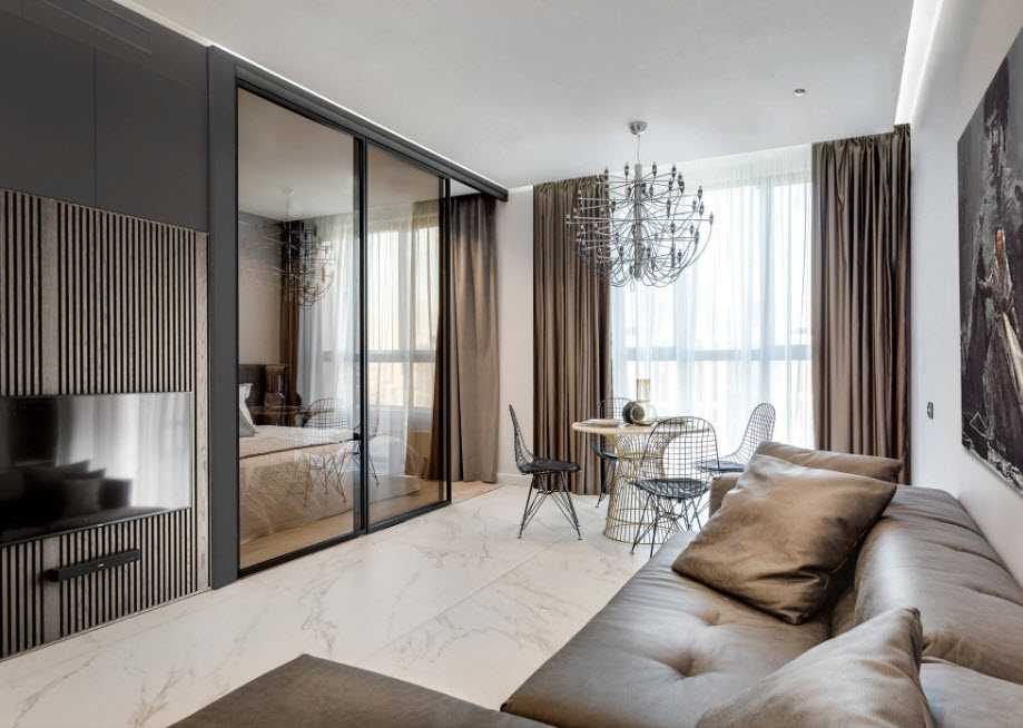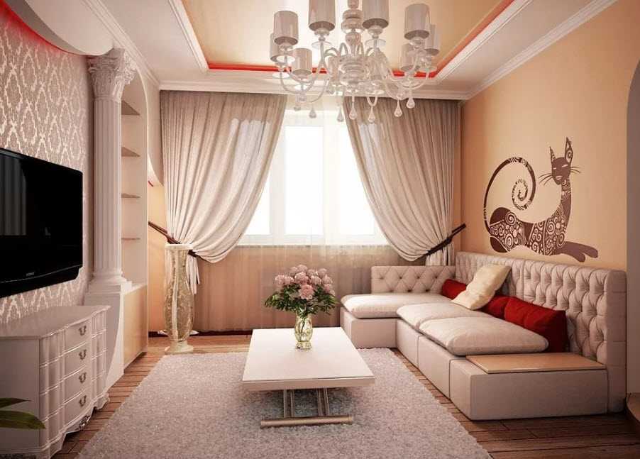 Что касается мебели, то она должна быть удобной и функциональной, лишние предметы лучше убрать. Разделяя небольшую гостиную на зоны можно использовать ширмы и перегородки, стеклянные или зеркальные элементы. Визуально увеличить пространство позволяет зеркала и глянцевые поверхности, натяжной потолок.