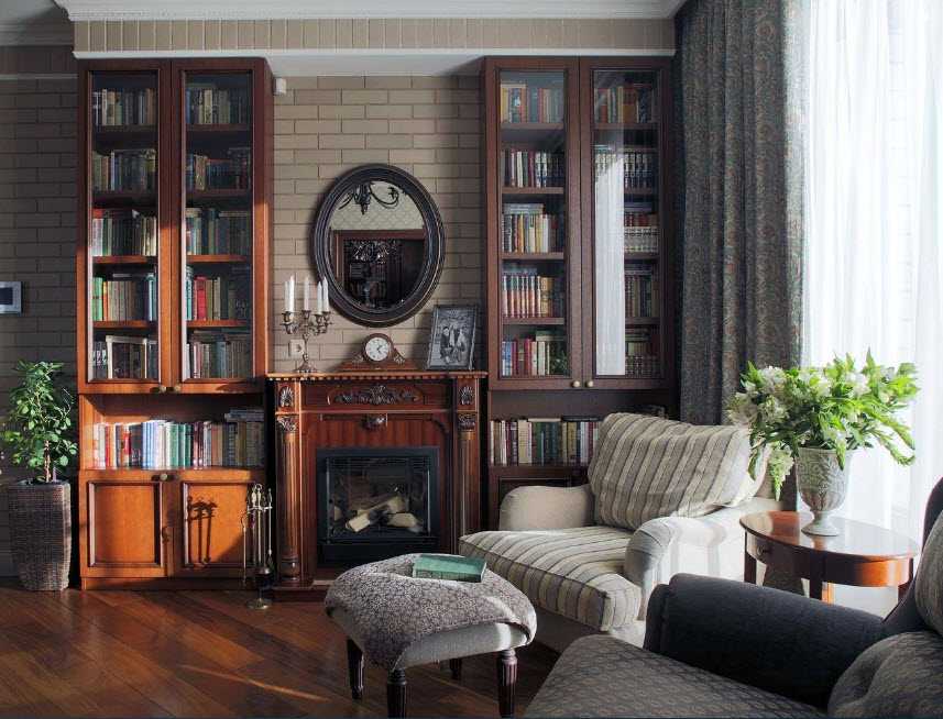 В основе подбора предметов мебели лежит целостность общей композиции. Для чего диван располагают по центру вместе с креслами около столика для журналов. Стало обыкновением присутствие камина, который может быть настоящим или декоративным. Технику обычно предпочитают «укрыть» за мебельным фасадом.