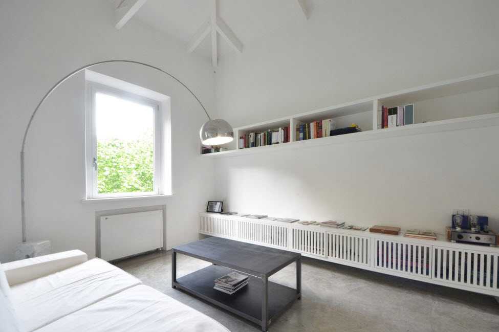 Удачный вариант для дачи, в которой не знают, что такое работа на участке. В противном случае, такой интерьер будет неуместен. Белоснежный диван гармонирует с книжными полками