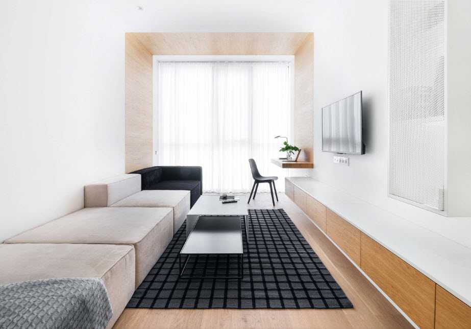 - Предпочтение более чем скромной обстановке отдают любители минимализма. Таким образом можно достичь присутствия большего пространства. Стоит отдать предпочтение неклассической мебели с пуфами вместо кресел;