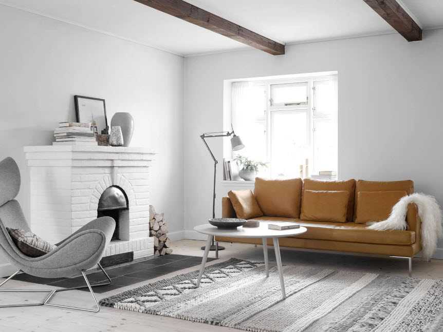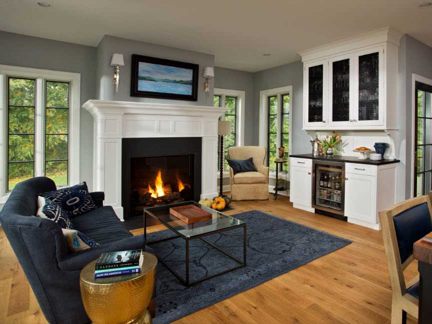 Мебель в комнате с камином следует размещать таким образом, чтобы удобно было располагаться около очага. Использование параллельной планировки позволяет добиться такого решения! В этом случае диван устанавливают параллельно камину, а неподалеку от него размещают журнальный столик.