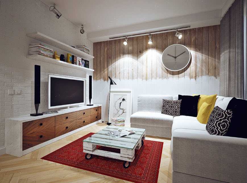 Деревянную стену в гостиной можно сделать разными способами. Если вам нравятся интерьеры с душой, найдите старые настенные доски, которые обязаны своим красивым внешним видом многолетнему воздействию солнца, ветра и снега. Аналогичный эффект будет обеспечен стилизованными, то есть вручную обработанным доскам. Дешевое решение, позволяющее получить отличные результаты, — это установка классических деревянных панелей. Достаточно покрасить их в белый цвет или защитить матовым прозрачным лаком. Отделка панелей, сделанная таким образом, придаст гостиной светлых и уютных скандинавских интерьеров.