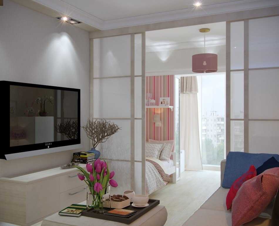 Место с кроватью лучше расположить подальше от дверного проема и отделить данный сегмент ширмой, занавесками, стеллажом или гипсокартонной перегородкой. Еще одним удачным вариантом зонирования станет применение разного напольного покрытия или возведение подиума. Максимально изолировать спальное место поможет установка раздвижных систем.