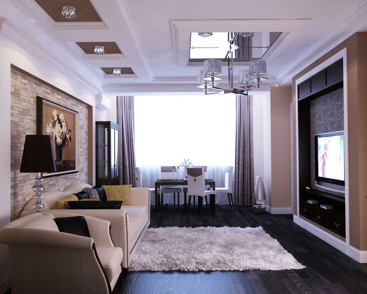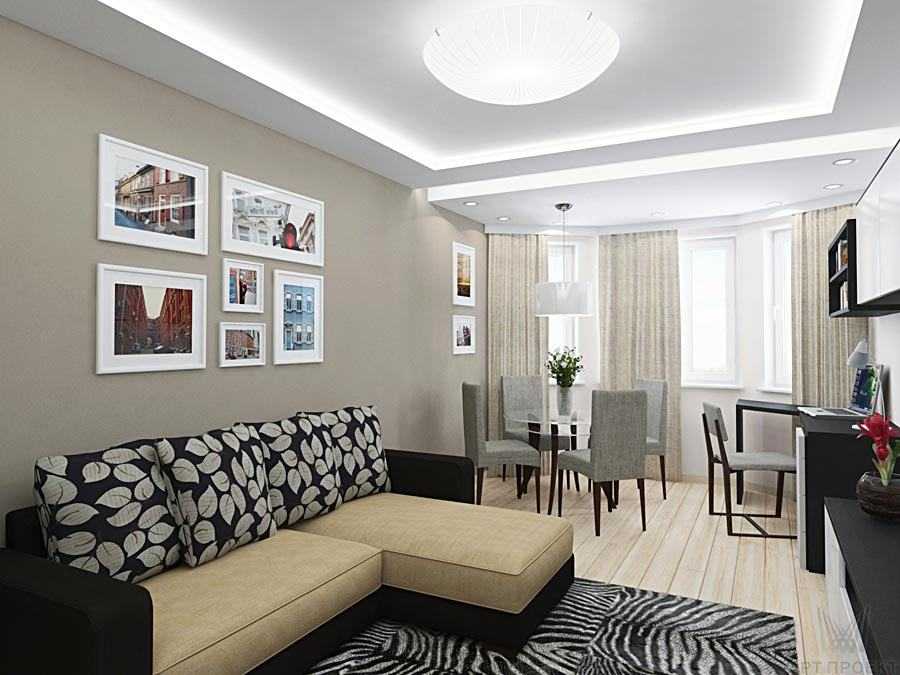 В интерьере гостиной в хрущевке, столовую зону со столом и стульями размещают возле окна или выносят ее на присоединенный балкон. Для того, чтобы выделить обеденный участок можно выбрать освещение, контрастную отделку или разноуровневый потолок.