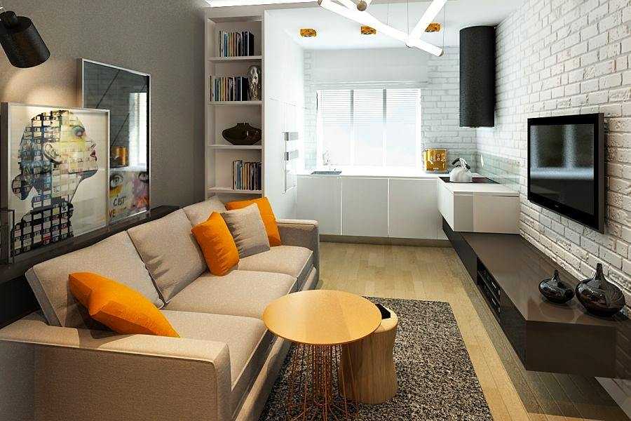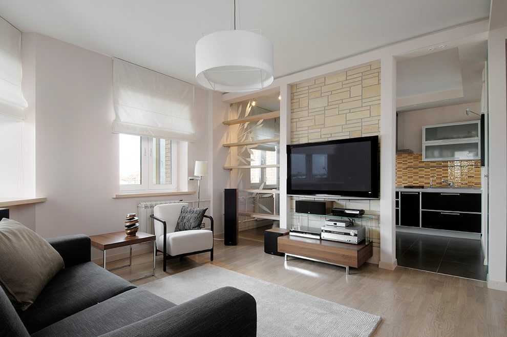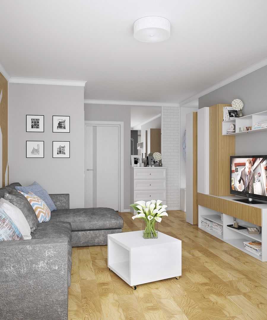 Для однокомнатных квартир решением может стать создание квартиры-студии – когда сносят все перегородки и объединяют комнату с кухней и прихожей. Последнюю чаще всего отделяют от гостиной мебелью или условным декором. Чтобы выделить кухню и отделить ее от жилой зоны, можно приподнять пол или использовать отличительное от комнаты напольное покрытие.