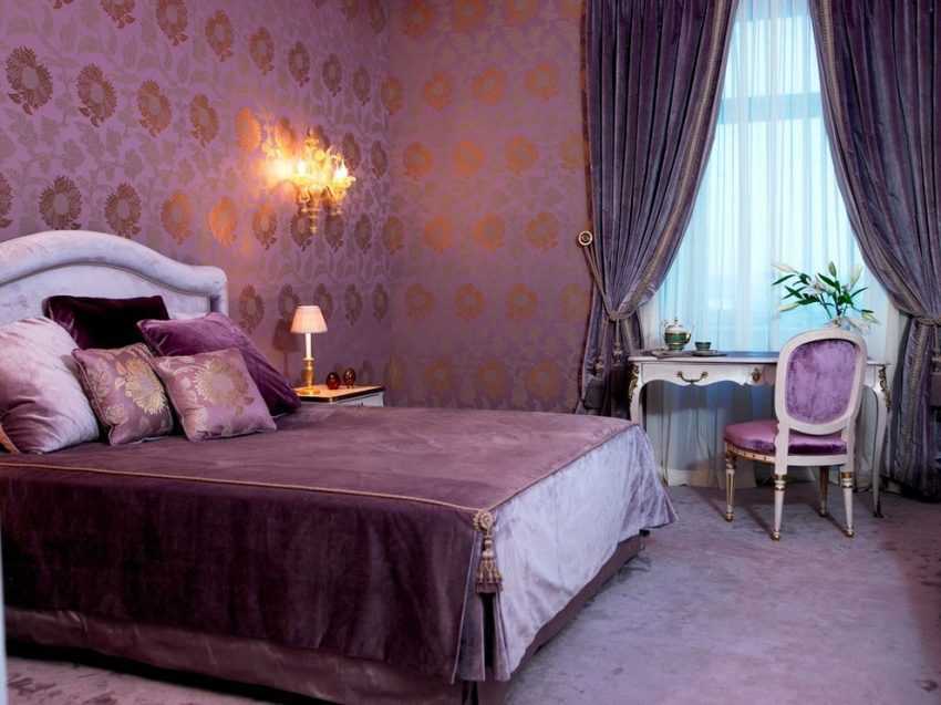 Сочетая разные цветовые решения, важно не использовать в дизайне спальни с фиолетовыми обоями более трех тонов базового цвета.