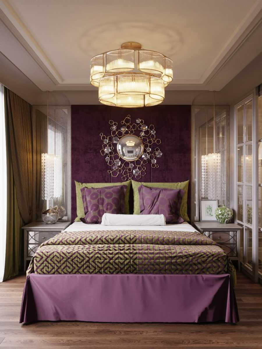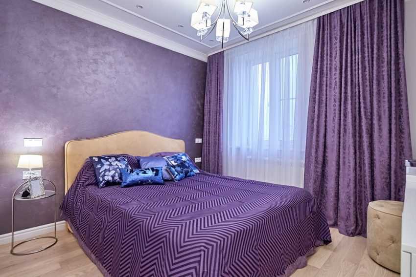 - насыщенная фиолетовая отделка выгодно подчеркнет темный тон мебели или белоснежного цвета постель, подушки можно подобрать контрастных цветов;