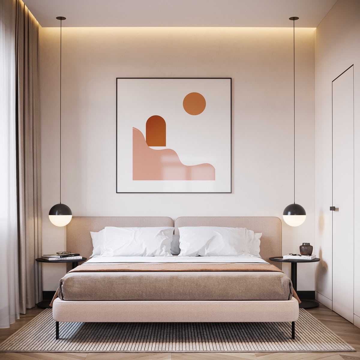 Одна из основных деталей в интерьере спальни 2021 — оригинальная лампа на потолке. Светильник может быть тонким и нежным, его стоит подвесить немного выше, в районе изголовья кровати либо в середине потолка. Лучший свет в комнате для отдыха – мягкий, он не должен быть навязчивым. Хорошим выбором будут светильники из соломки, с простыми плафонами из грубоватой ткани, из матового стекла.