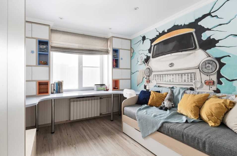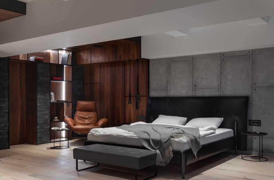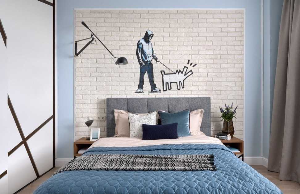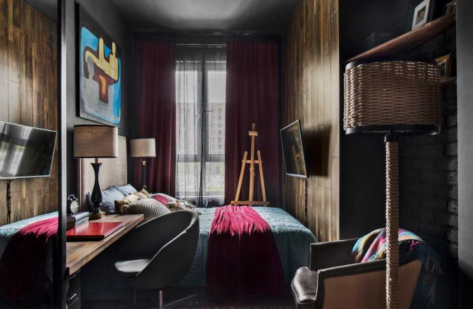Урбанистическая тематика с характерными для нее четкими геометрическими линиями, использованием инновационных материалов плюс детали, выполненные в индустриальном стиле – светильники на потолке, металлическая сетка в качестве декора мебельных фасадов. Текстиль – со сложным геометрическим рисунком контрастных оттенков.