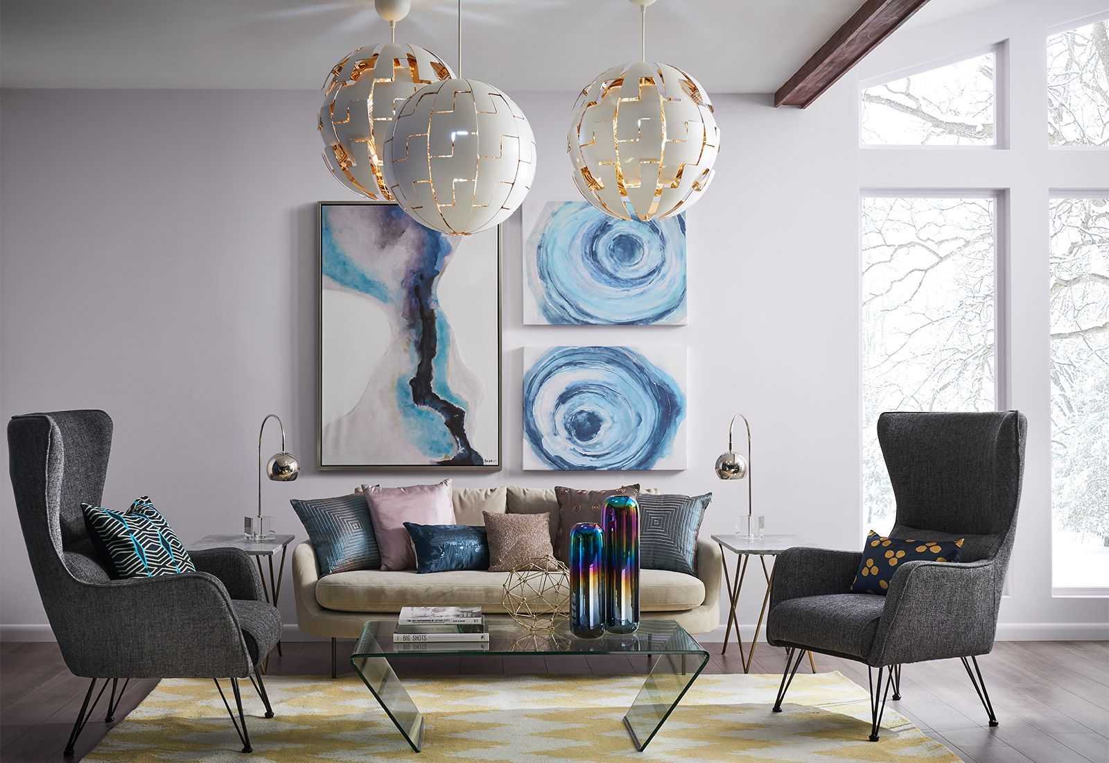- Что касается освещения, то в тренде будут простые настольные лампы, светильники необычных форм (геометрические фигуры), подвесные лампы в виде пузырьков, шаров и т. д.