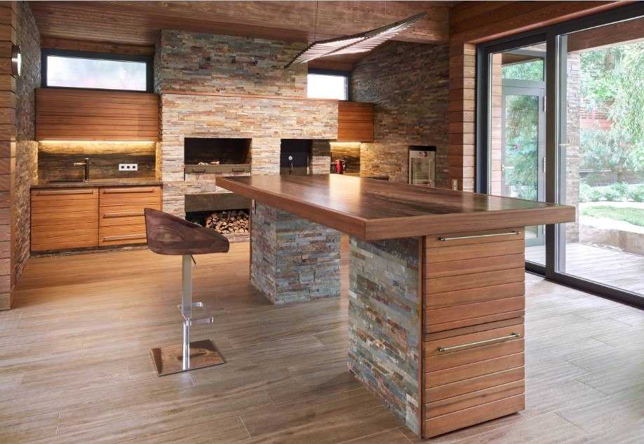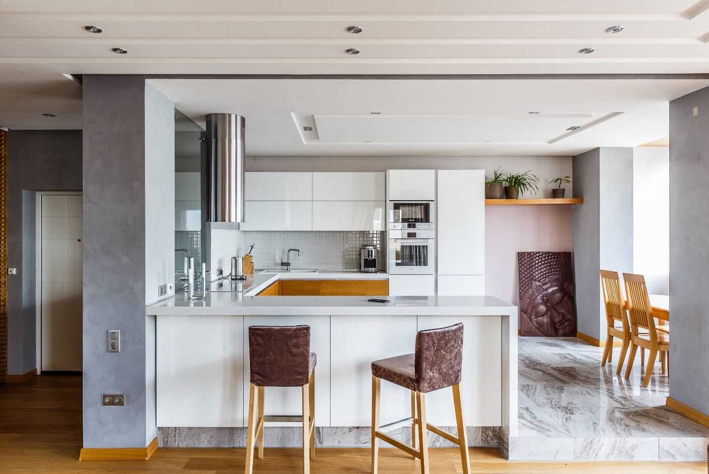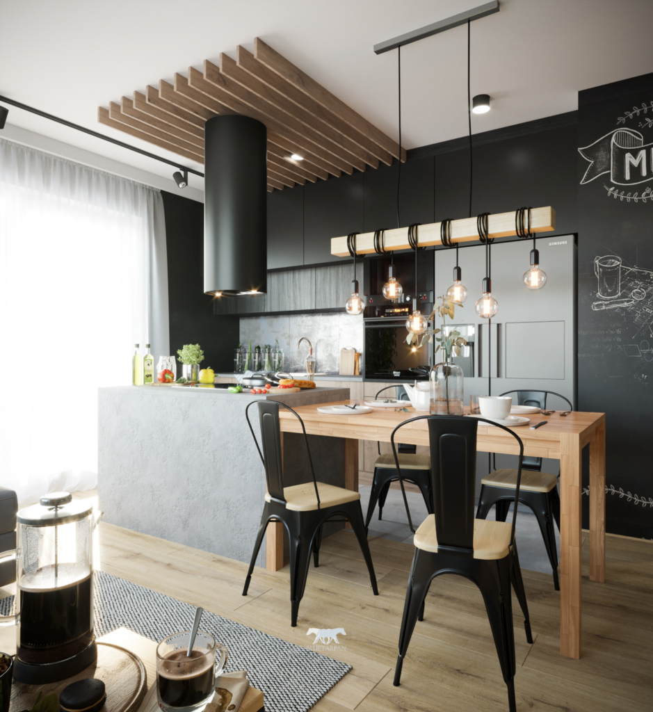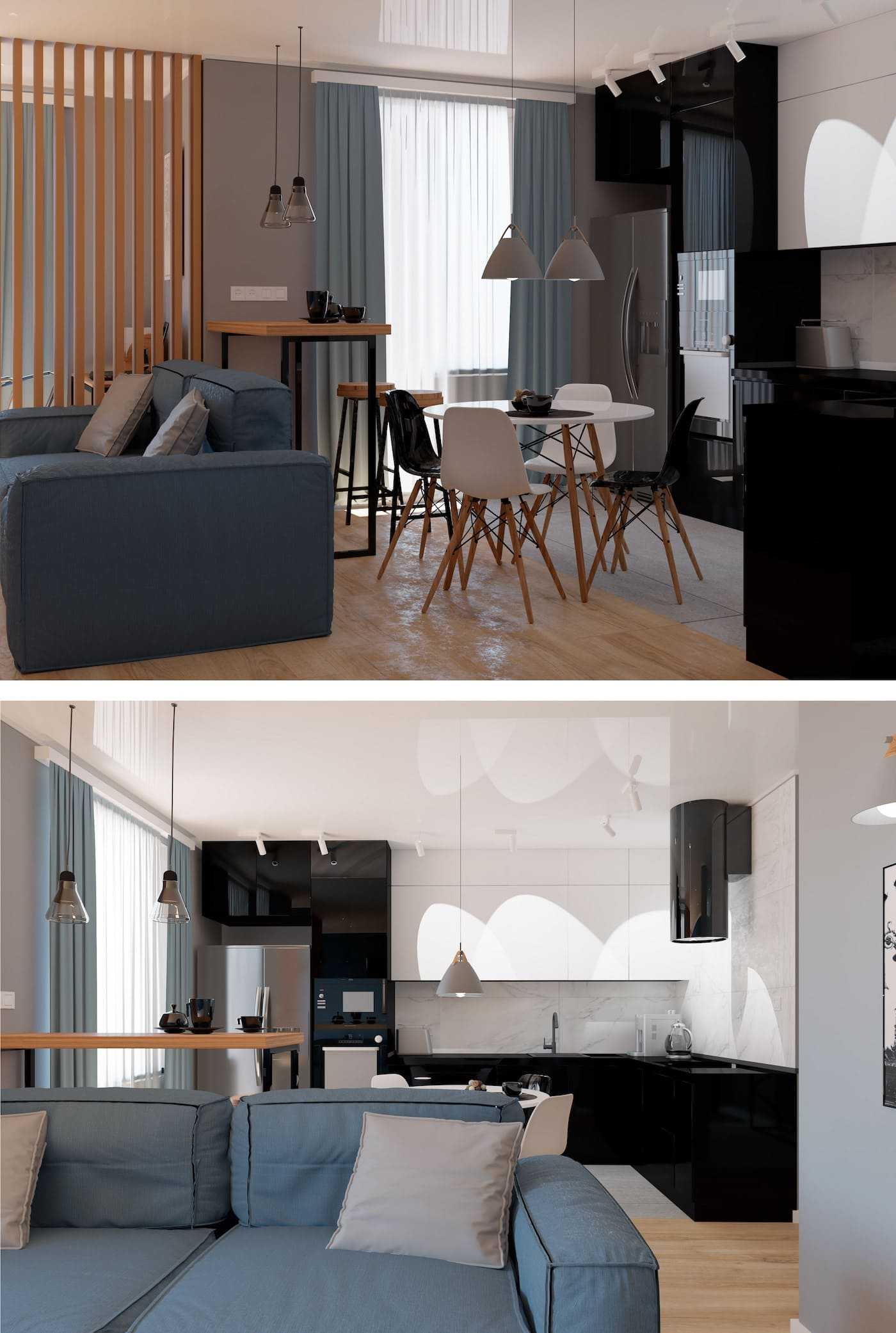 Не смотря на все «против» в 2021 году, проектировщики продолжают совмещать между собой кухонную зону и гостиное пространство, одновременно разделяя их раздвижными панелями и оригинальными перегородками, которые чётко определяют границы. Такая реконструкция позволяют заниматься приготовлением еды, не прерывая общения с гостями или остальными членами семьи, что, по мнению психологов, делает общение более близким.