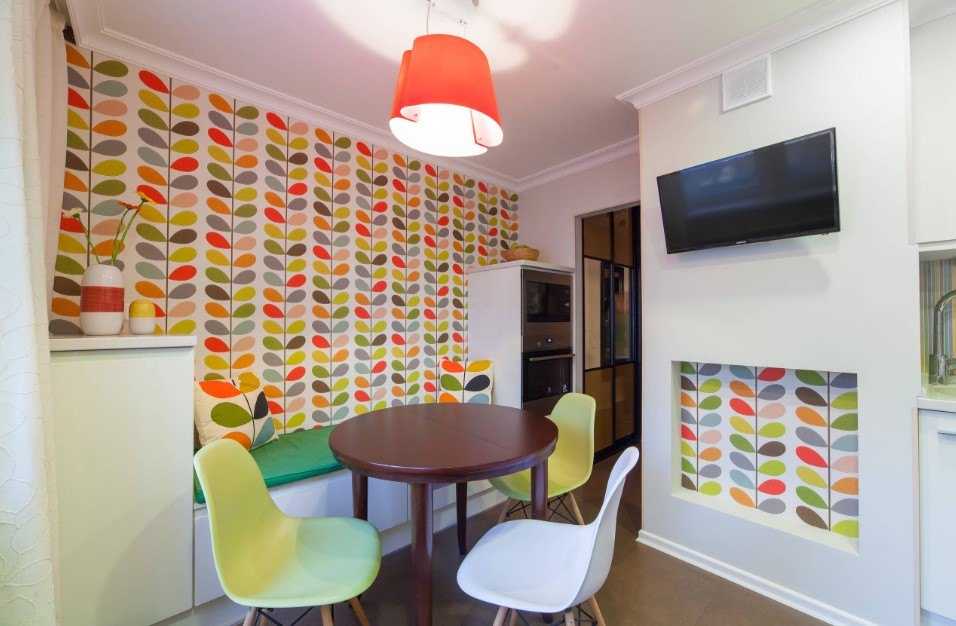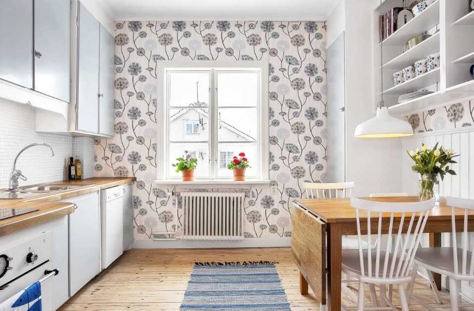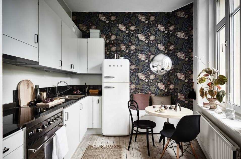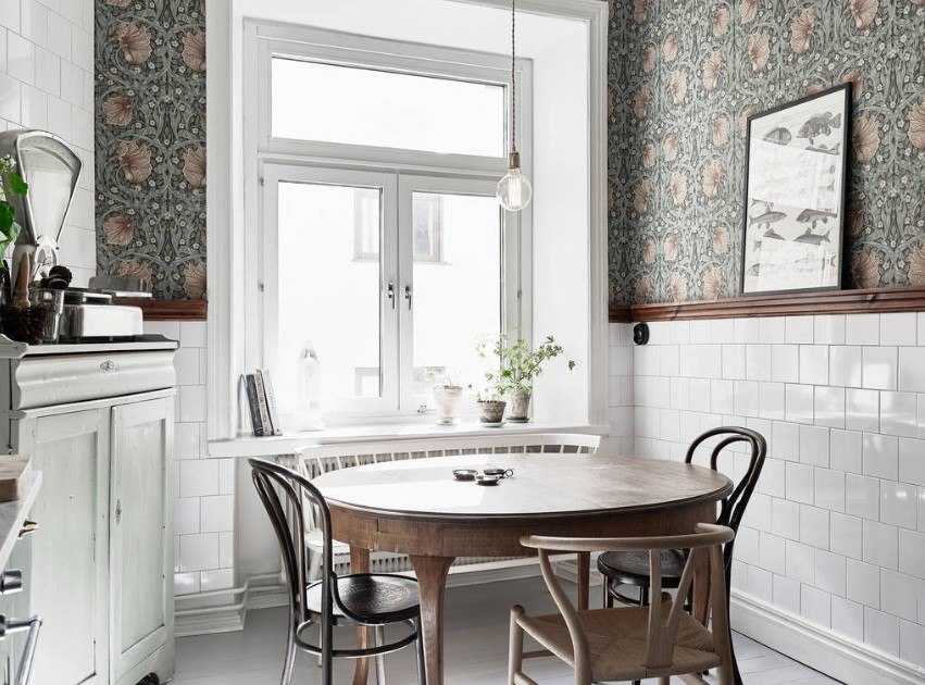 В кухонном интерьере ярким акцентом может послужить плитка – обычная или ретро, если поместить ее в стеновых частях или зоне отдыха. Узорчатые обои с различными размерами, любого формата, придают пространству неповторимый шарм.