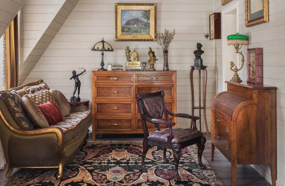 Перебор создаст «нафталиновое» настроение, испортив общее впечатление. В качестве акцента вполне достаточно оставить в гостиной старую люстру, журнальный столик или трюмо.
