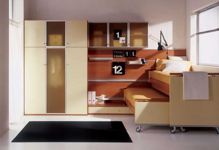Если у вас не один ребенок, а комната маленькая, то проблему с размещением кровати можно решить несколькими способами: