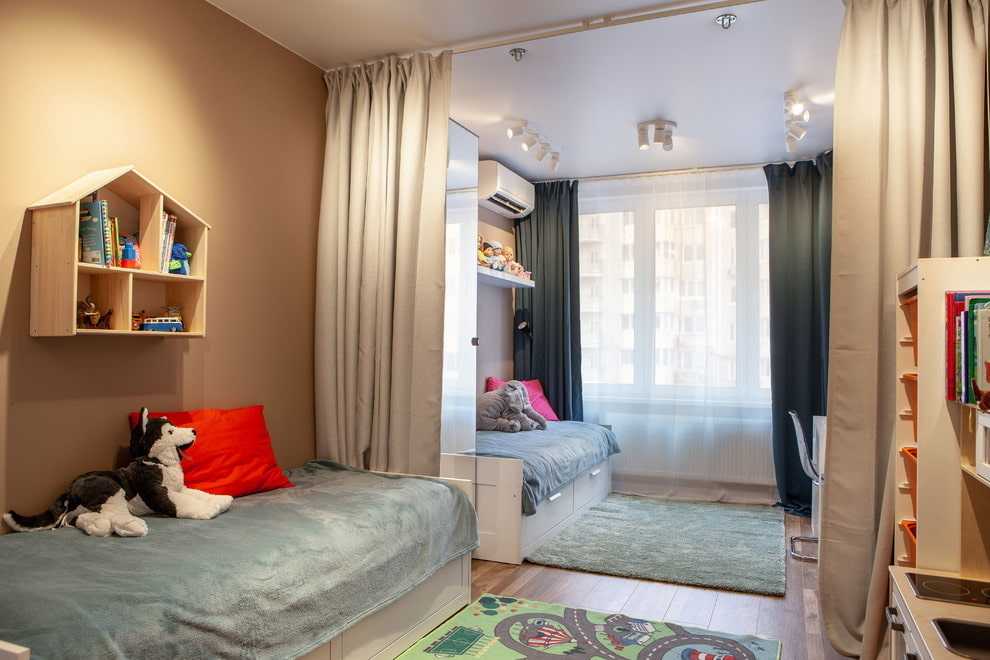 С возрастом детям потребуется больше личного пространства. Так как места немного, следует зонировать хотя бы спальные места. Хорошо для этого дела подходят непрозрачные шторы или жалюзи. Они определяют границы и занимают минимум места. К тому же их легко сдвинуть в дневное время.