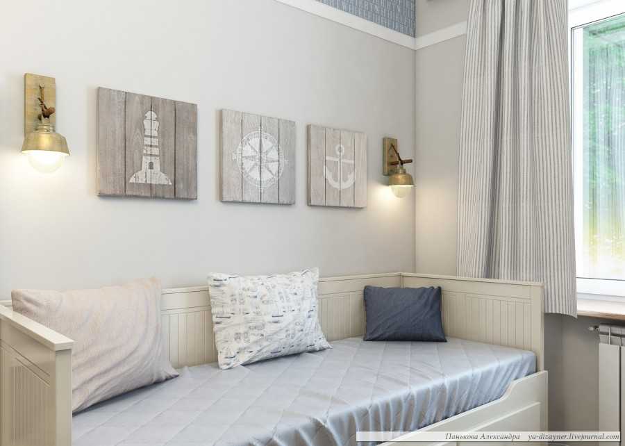 Очень интересным решением, является персонализация кроватей именными табличками. Каждое спальное место должно быть оборудовано освещением, в виде бра. Также возможно применение мебельной подсветки для шкафа или комода.