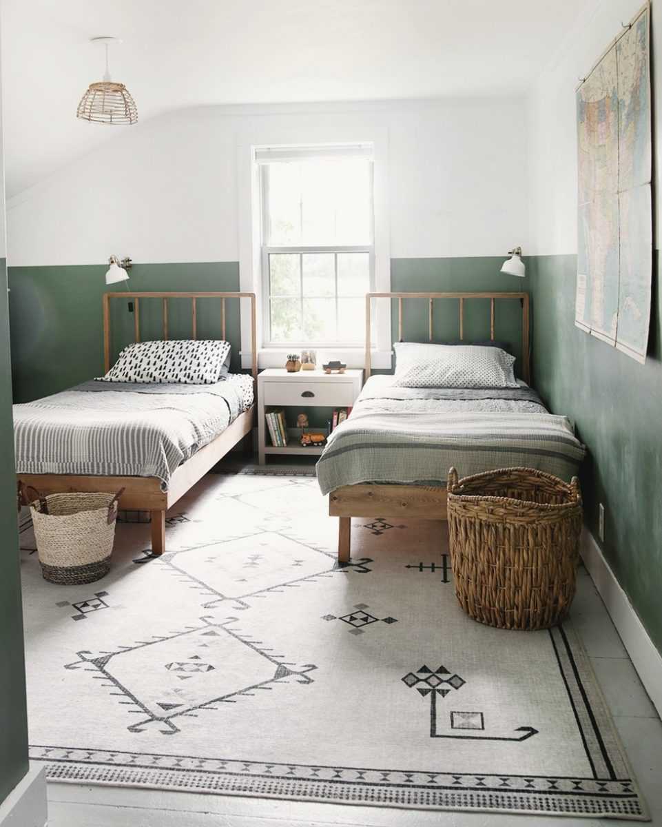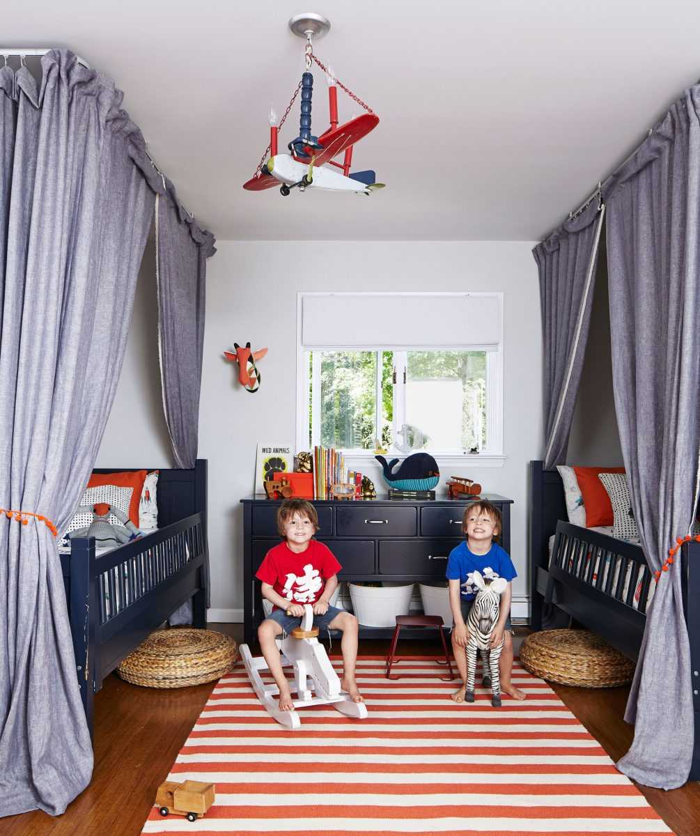 Поскольку средняя разница в возрасте между детьми составляет около 5 лет, то один ребенок еще маленький, а второй уже школьник. Следовательно, необходимо провести зонирование пространства спальни, чтобы отделить игровую зону от рабочего места. Разделить их можно при помощи отделки комбинированными обоями, мебели, небольшой перегородки.