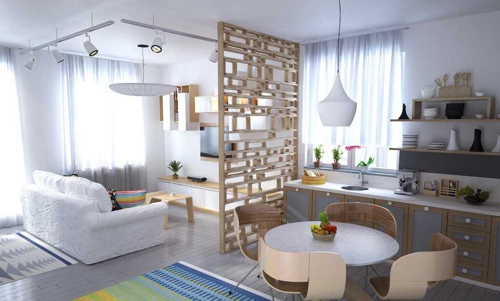 - зонирование с помощью деревянных конструкций или кованых изделий;