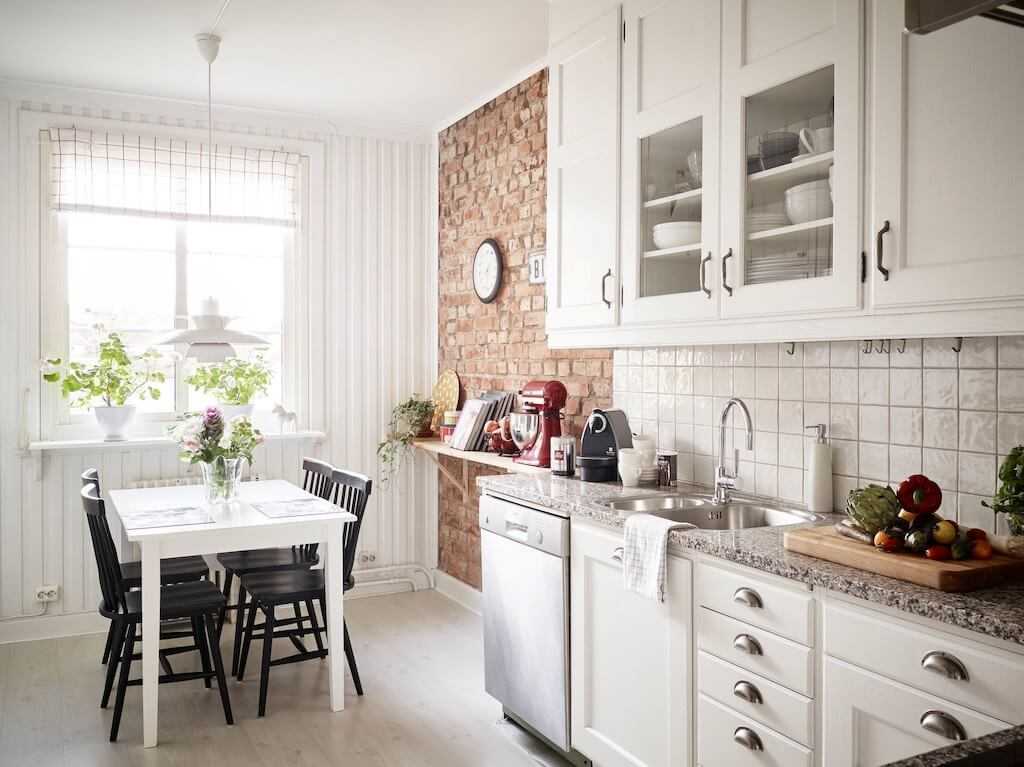 Серьезных требований к стенам скандинавский стиль не предъявляет — это могут быть обои с рисунком, монохромная краска или кирпичная кладка. Но стоит учитывать размеры помещения: весь декор на стенах будет сужать комнату, поэтому его лучше избегать на маленькой кухне.