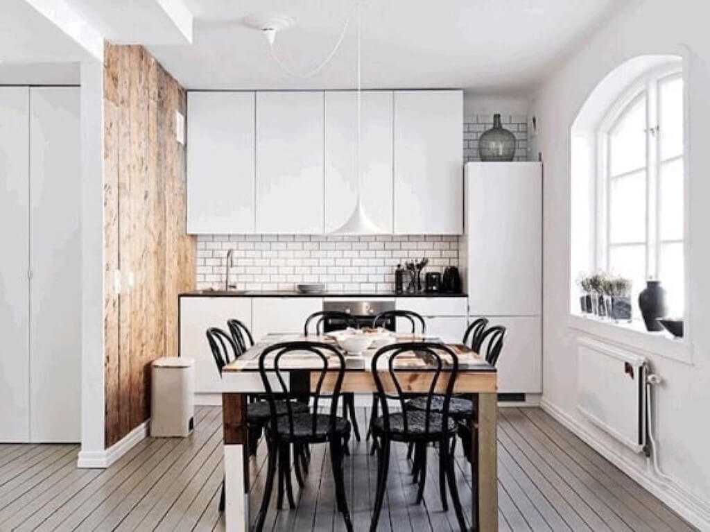 Скандинавский стиль в идеале строится на контрасте белого и темных глубоких оттенков. Но на маленькой кухне такое сочетание будет смотреться слишком тяжело и дополнительно уменьшать комнату, поэтому в отделке лучше отдавать предпочтение светлым материалам, а контраст добавлять в декор — это беспроигрышный вариант интерьера.