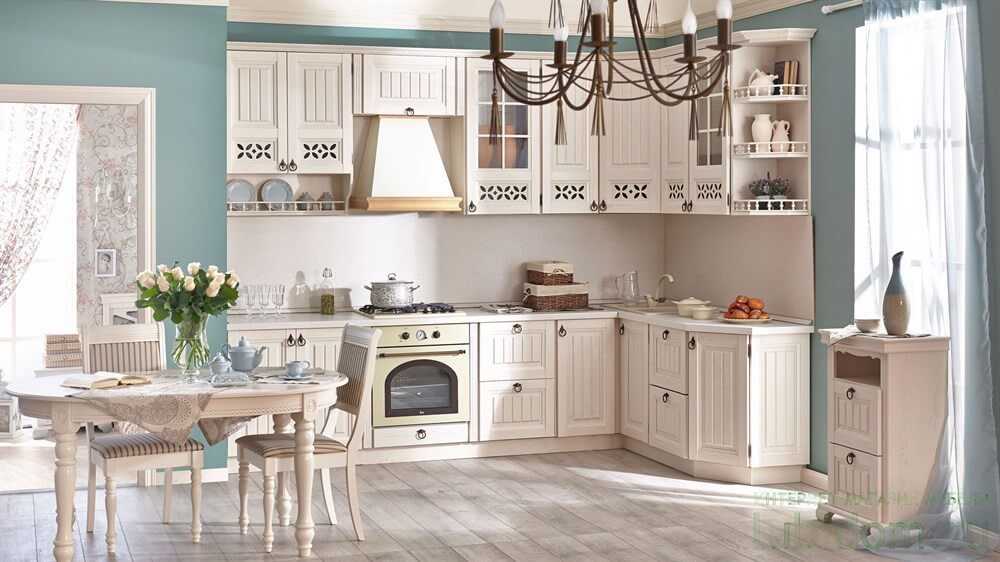 На такой кухне гармонично смотрится деревянная мебель с металлическими или стеклянными элементами. Кухонный фартук, как правило, отделывают кафельной плиткой или стилизованными под дерево панелями.