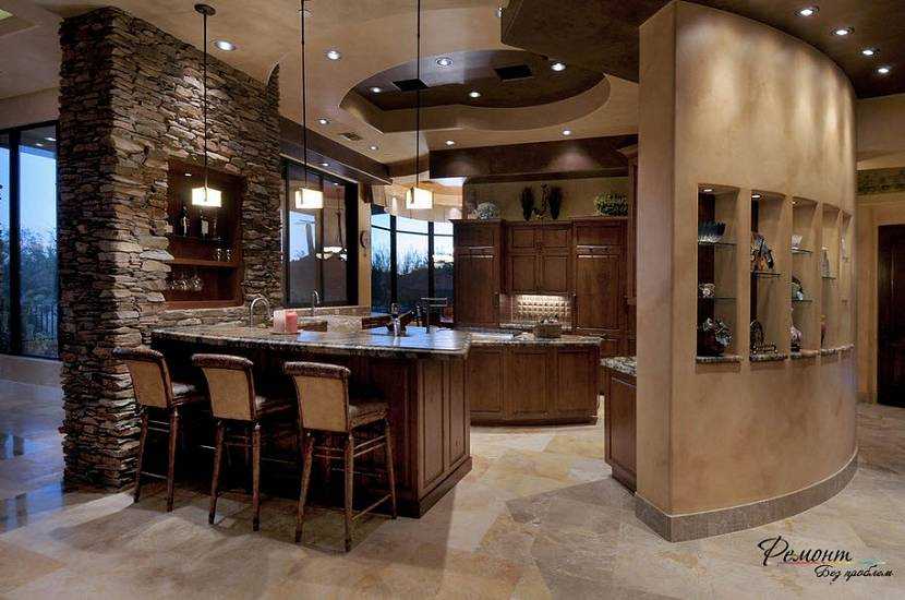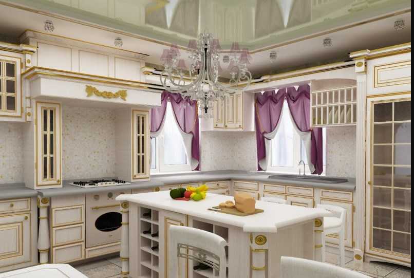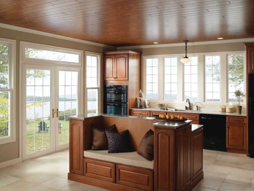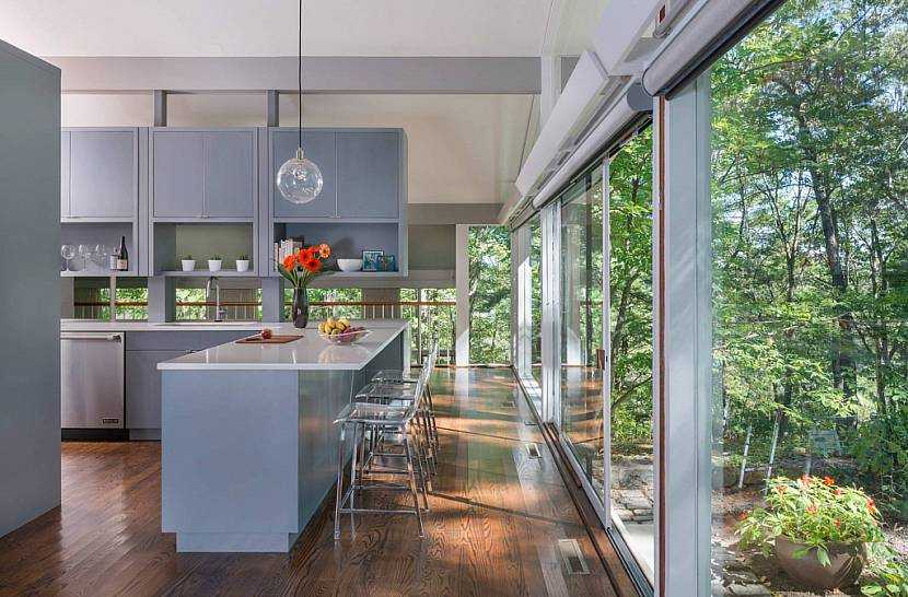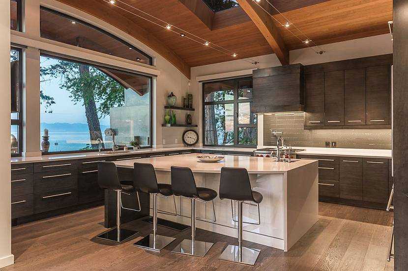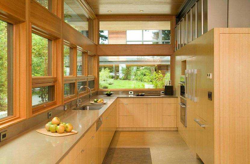 Такие кухни обычно имеют большую площадь. Их обустраивают в загородных домах. В зоне напротив окон целесообразно размещать барные стойки или длинные столешницы. Для габаритных оконных проемов нужно правильно подбирать стиль. Кухня должна смотреться богато как снаружи, так и внутри.