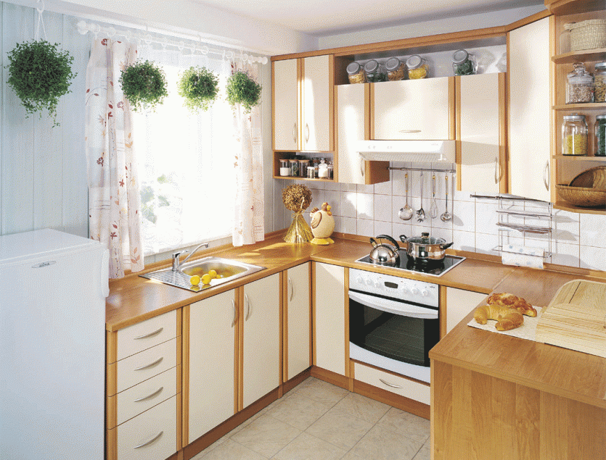Для окон кухни в «деревенском» стиле очень хорошо подойдут шторы-кафе, так как они смогут защитить стекла от брызг, немного затенят помещение, но при этом оставят окно открытым. Ниже в фото-слайдере представлен интерьер П-образной кухни с окном, оформленным шторами-кафе в стиле кантри.
