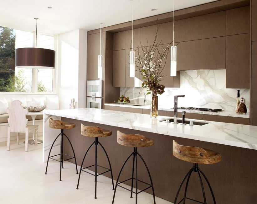 Конструкция может выполняться на одной высоте, либо иметь двухуровневую поверхность. Актуальное решение для небольших площадей, когда экономить приходится каждый сантиметр. Из материалов используют искусственный кориан, МДФ, ламинированное ДСП, влагостойкий гипсокартон. Можно сделать вместо столешницы оригинальную, стильную барную стойку.