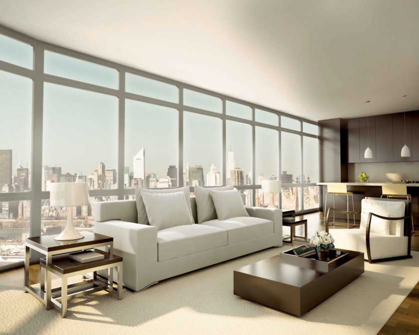 Просторные площади позволяют реализовать множество интересных решений. Можно дополнить дизайн помещения с панорамными окнами большим аквариумом, создать мягкий уголок, использовать вместо обычных стульев мягкие пуфы.