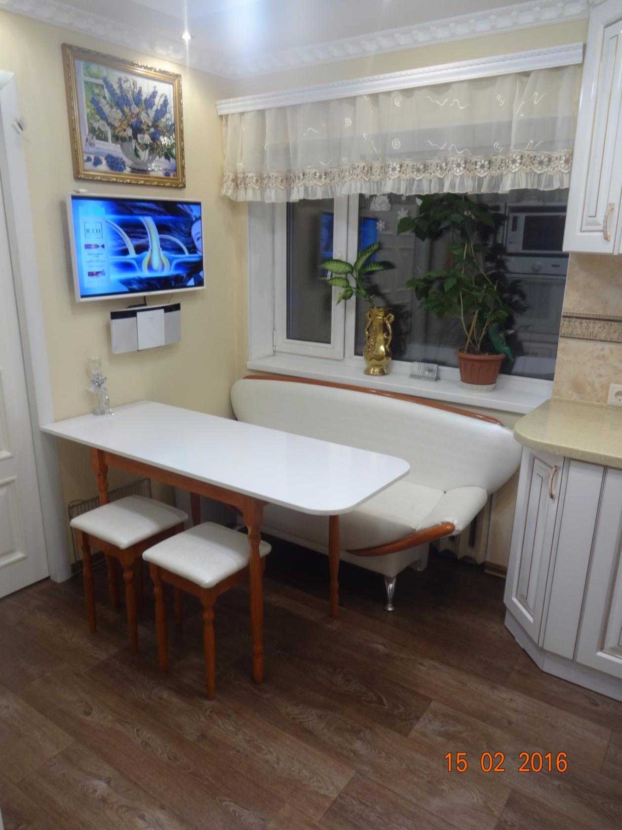 В зависимости от размеров помещения у окна на кухне можно поставить малогабаритный или угловой диван