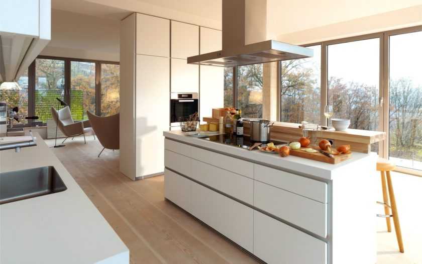 Массивные окна открывают жизнь внутри кухни. Поэтому необходимо правильно подойти к организации интерьера. Актуальная идея создать две разные зоны в одном помещении. Зона готовки с центральной вытяжкой придают кухне объем и богатый стиль. Обеденная зона выполнена в бежевом цвете. Кухонный гарнитур создает видимый контраст на фоне темных панорамных окон.