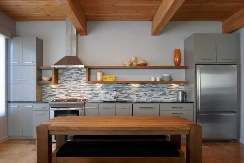 - Декорировать стены и пол кухни деревянными панелями. Выбор дерева в качестве отделки не случаен. Натуральный материал формирует на кухне благоприятный микроклимат и отвечает за неброский, минималистичный дизайн.