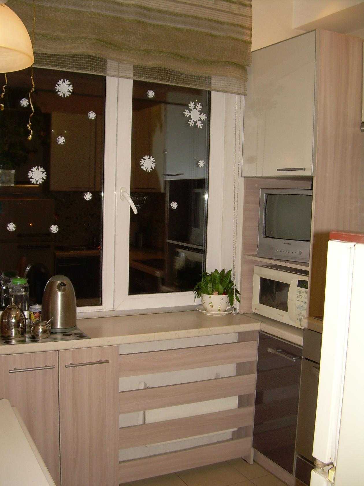 Впрочем, иногда можно обойтись без радикальных мер и просто выстроить гарнитур вдоль окна, укрепив при этом его заднюю стенку и … смирившись с ограничением угла раскрытия створок. В итоге между напольными тумбами и окном получится ниша, которую можно приспособить для хранения цветочных горшков или кухонных мелочей. Ниже на фото вы можете увидеть пример кухни в хрущевке с такой дизайн-хитростью.
