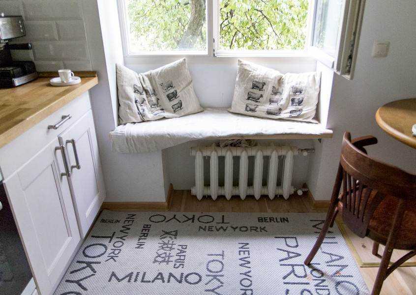 Популярно располагать ее у окна на кухне. Особенно удобен он, когда есть балконная дверь, к которой нужен доступ.
