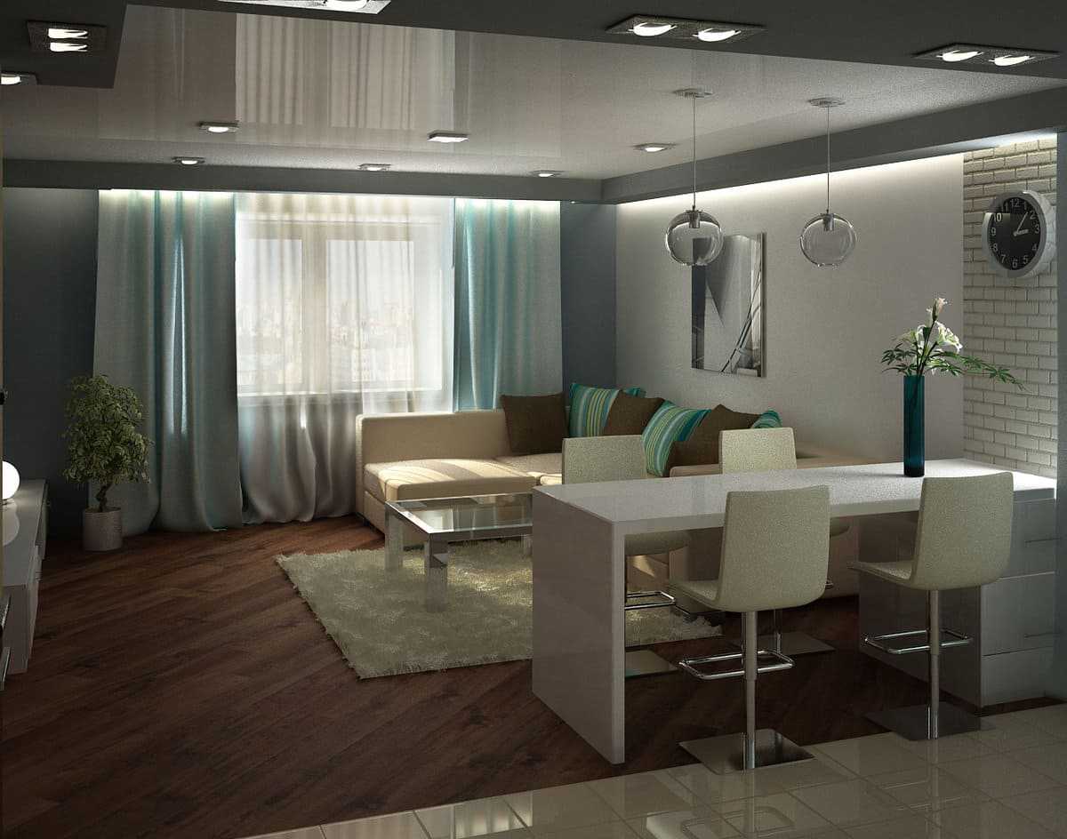 Барная стойка занимает первое место по популярности. Фото дизайна интерьера кухни-гостиной в «хрущевке» отлично показывает, как можно вписать стойку в квартиру. Она будет выполнять роль столешницы и обеденного стола.