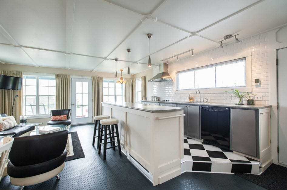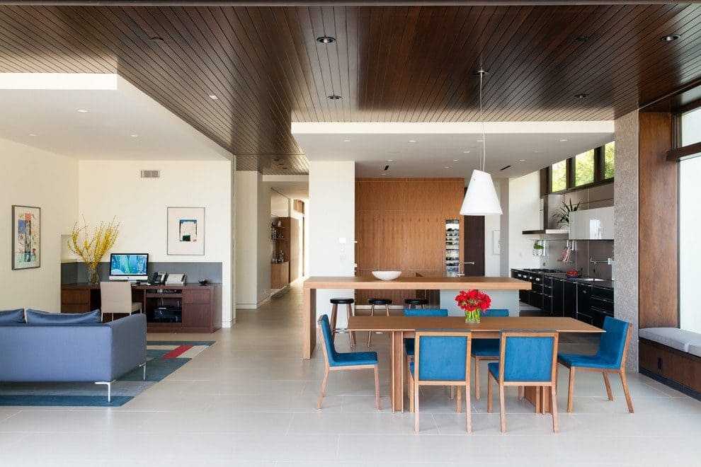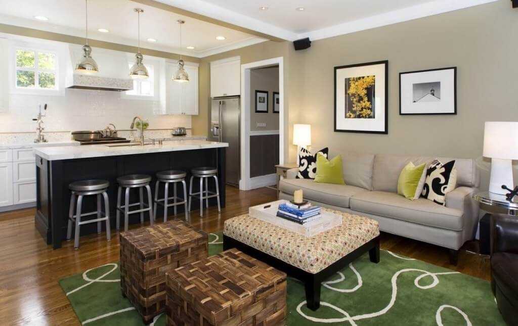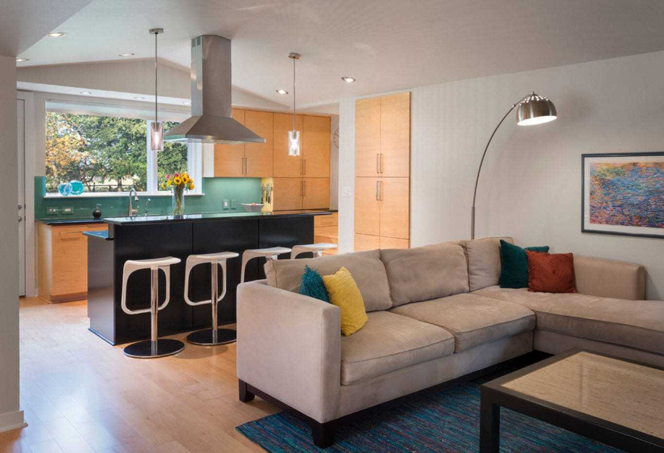 Наиболее распространенные решения в этом типе договоренности — зонирование кухни и гостиной. Это можно сделать, правильно расставив мебель. Границей может быть диван, кухонный остров, бар или стол. Стеклянные и складные стены, например, гармошка, также все чаще встречаются. Другой вариант установить границу — изменить напольное покрытие, сочетая дерево в гостиной с плиткой на кухне.