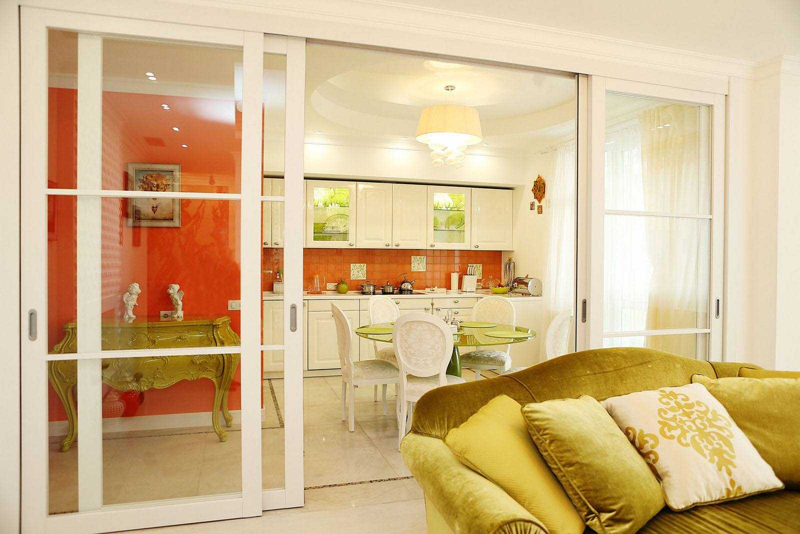 Оригинальность придадут перегородки, раздвижные стеклянные двери. Второй вариант надо использовать осмотрительно, если в квартире проживают маленькие дети, пожилые люди: не заметив прозрачные дверцы, человек может сильно покалечиться.