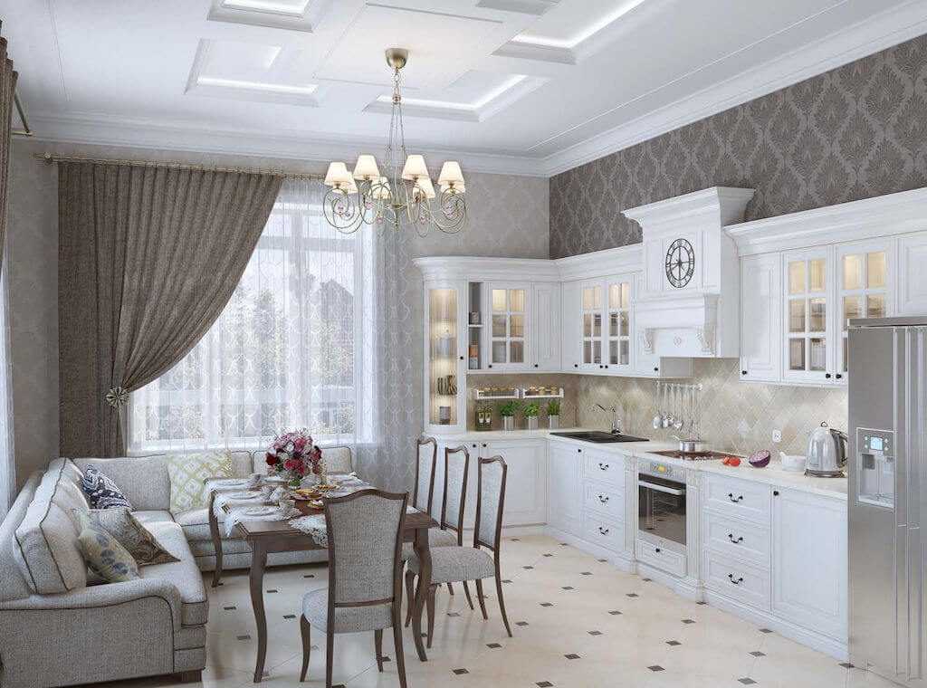 Если вкупе совмещенные комнаты образовали стандартное помещение прямоугольной формы, планировка может быть не только линейной. Здесь можно поставить угловую кухню, причем как с полуостровом, так и с островом либо с мебельной линией из напольных шкафов напротив основного рабочего пространства. Когда комната стремится к квадратной форме, можно обустроить ее П-образной кухней.