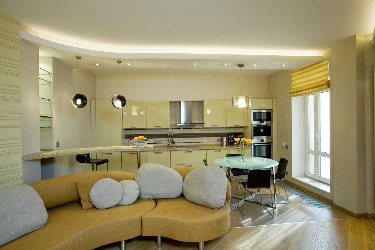 Если планировка квартиры с кухней-гостиной отличается большими размерами и предполагает наличие высокого потолка, зонирование можно выполнить за счет разноуровневого потолочного или напольного оформления. Для создания четких границ кухонную зону размещают на невысокий подиум или выделяют с помощью более низкого уровня натяжного или подвесного потолка со встроенной системой освещения.