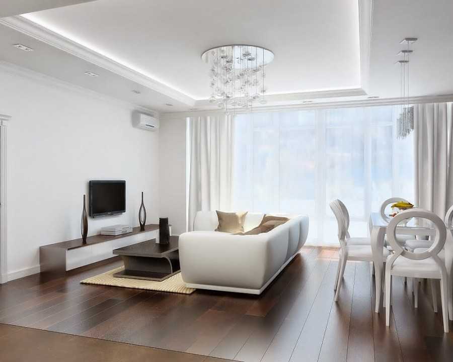 Зонирование производят разнообразными методами, это комбинирование с помощью света, применение контрастных оттенков и натяжных (подвесных) потолков, различных по фактуре, расцветке и уровням.
