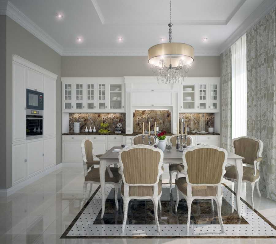 Очень стильно и изысканно смотрятся кухонные проекты, где поверхности кухонного гарнитура и обеденной зоны имеют глянцевые или зеркальные покрытия. Сюда же прекрасно вписываются и стеклянные элементы.