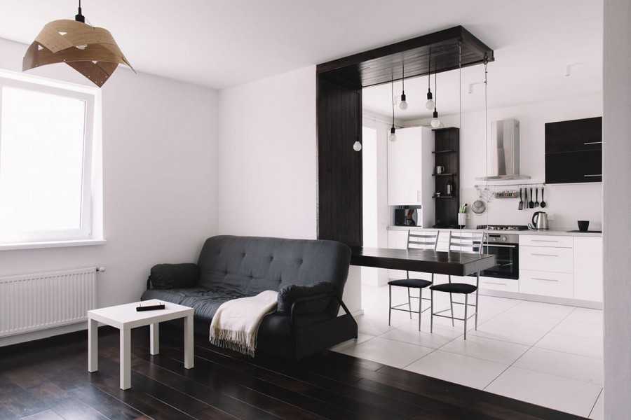 - Открытая планировка позволяет добавить простораЕсли вы можете сделать перепланировку однокомнатной квартиры и превратить кухню и гостиную в одну комнату, не упускайте такую возможность! Открытая планировка кухни-гостиной всегда хорошо смотрится в современном интерьере. Зонирующим элементом в данном случае может выступать перегородка, диван, стол, люстра или даже материал для отделки пола или цветовые акценты.
