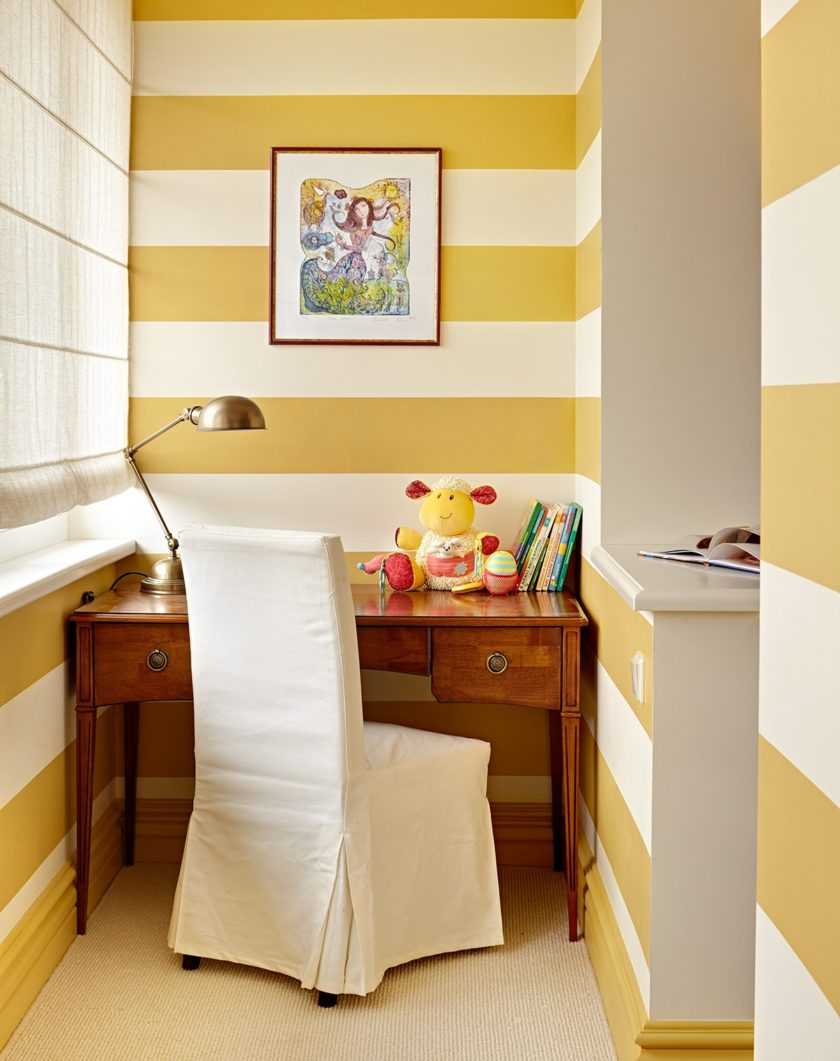 Интерьер мини-офиса выполнен в теплой гамме. Такие оттенки способствуют продуктивной работе и располагают к психологическому комфорту даже в пасмурную погоду. В основании листы гипсокартона, сверху – обои под покраску. Одно из главных условий при обустройстве рабочего места – правильное освещение. Естественное освещение необходимо дополнить искусственными источниками. Регулировать солнечные лучи можно при помощи жалюзи или рулонных штор из плотного текстиля, цвет которых подбирают в соответствии с палитрой отделки.