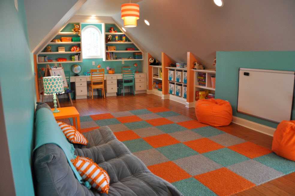 Детская комната на месте старого чердака – чудеса переделки позволят организовать сказочное пространство. Превыше всего здесь – безопасность. Отделочные материалы выбираются самые экологичные. Лестница – максимально пологая, обязательно с прочными перилами, люк на этаж надежно закрывается. Хорошее освещение необходимо по всей площади комнаты. Непременный атрибут детской – игрушки. Они размещаются на полках, в ящиках.