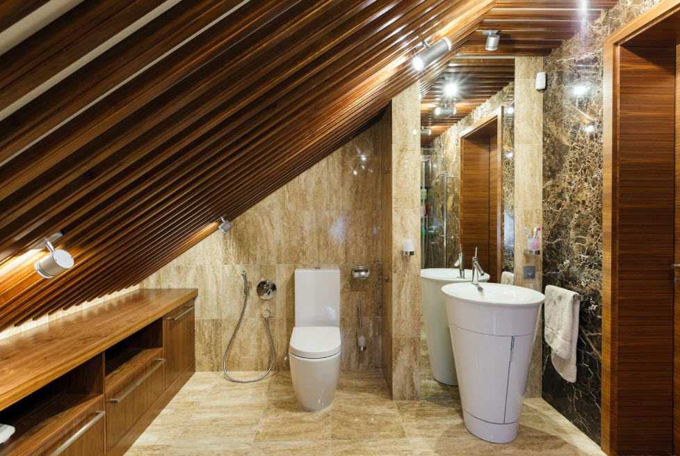 Устройство ванной комнаты, совмещенного санузла в чердачном пространстве вполне возможно. Она оформляется влагостойкими материалами, здесь организуется подача воды, ее отведение. Сама ванна часто монтируется под скосом крыши, душевую кабинку размещают ближе к середине помещения, где можно встать в полный рост. Часто ванная размещается рядом с кухней либо над ней. Панорамные окна создадут неповторимый интерьер.