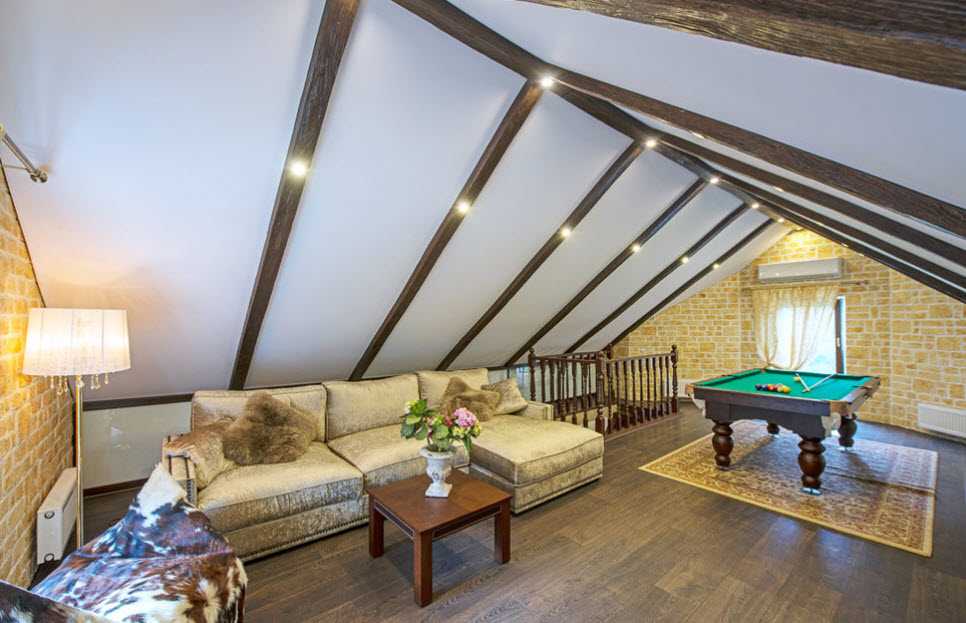 Атмосфера мансардного помещения отлично способствует соответствующему настрою для размеренной игры в бильярд